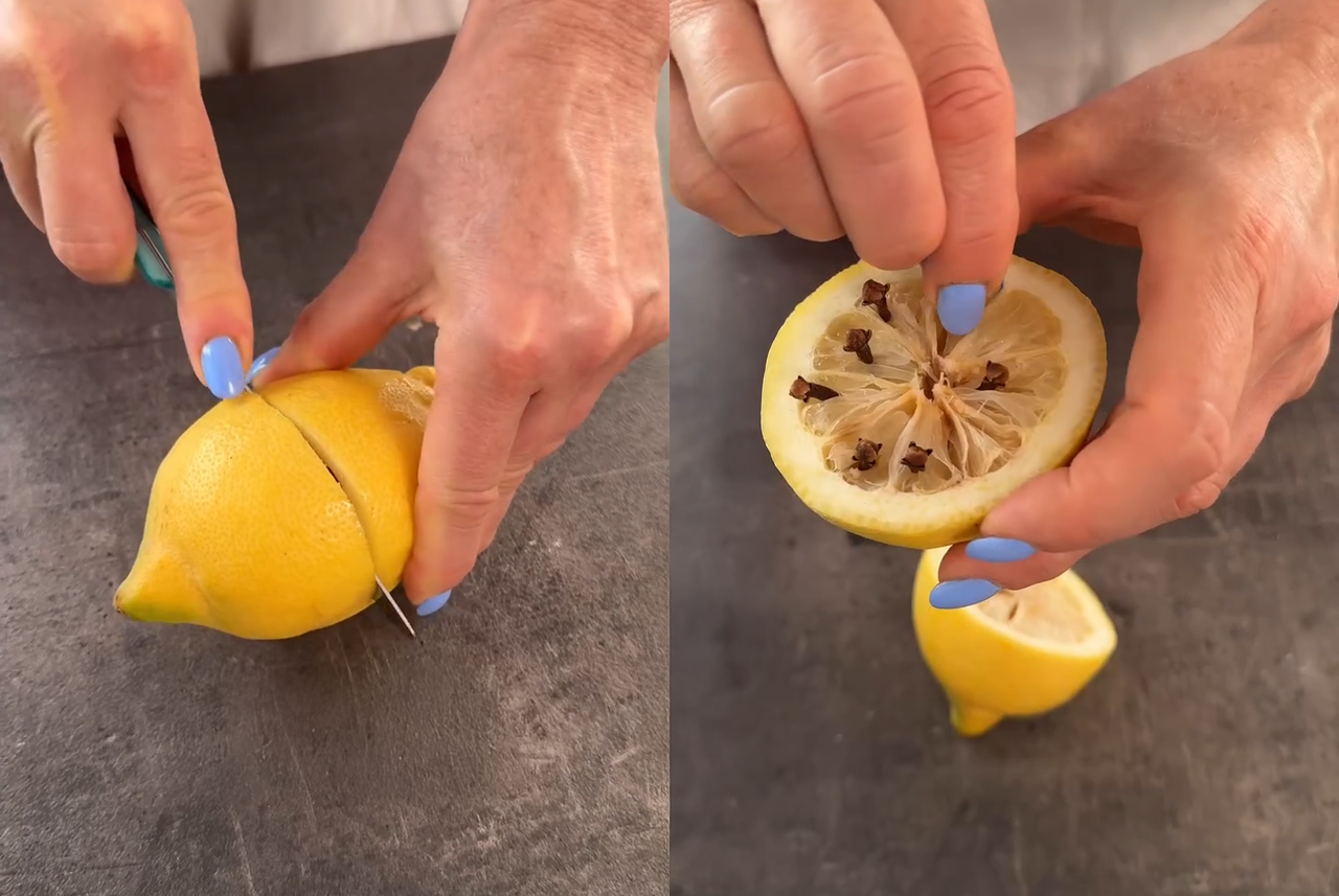 Uno dei miei rimedi preferiti (e tra i più scenografici!) è quello che combina il profumo fresco del limone con l’aroma intenso dei chiodi di garofano. Basta tagliare un limone a metà, infilare al suo interno diversi chiodi di garofano — spingendoli bene nella polpa — e posizionare il tutto vicino a finestre, porte o sul tavolo da pranzo.