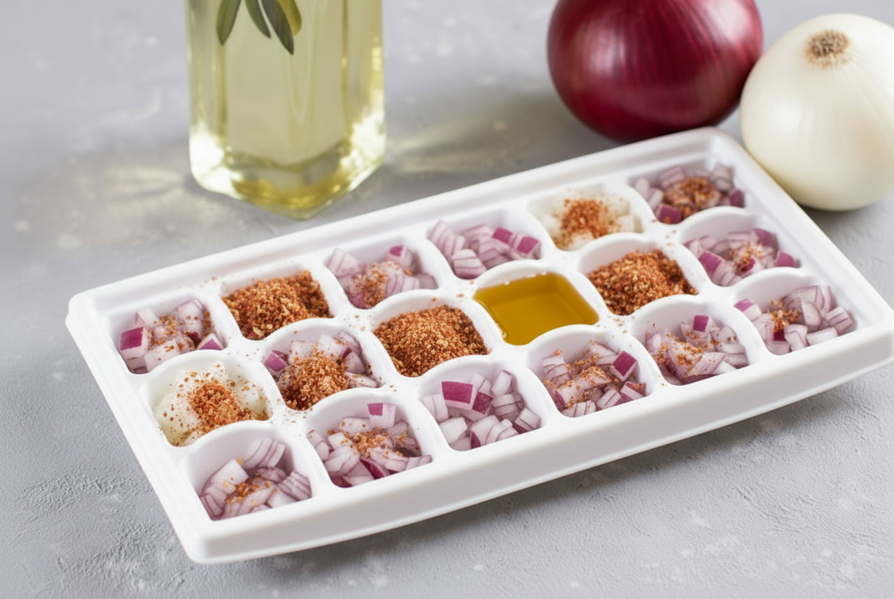 Vuoi un condimento pratico sempre a portata di mano? Ecco come trasformare la spezia ottenuta nel passaggio precedente in dadi aromatici pronti all’uso. Ideali da tenere in freezer, da usare al bisogno in soffritti, sughi o secondi.