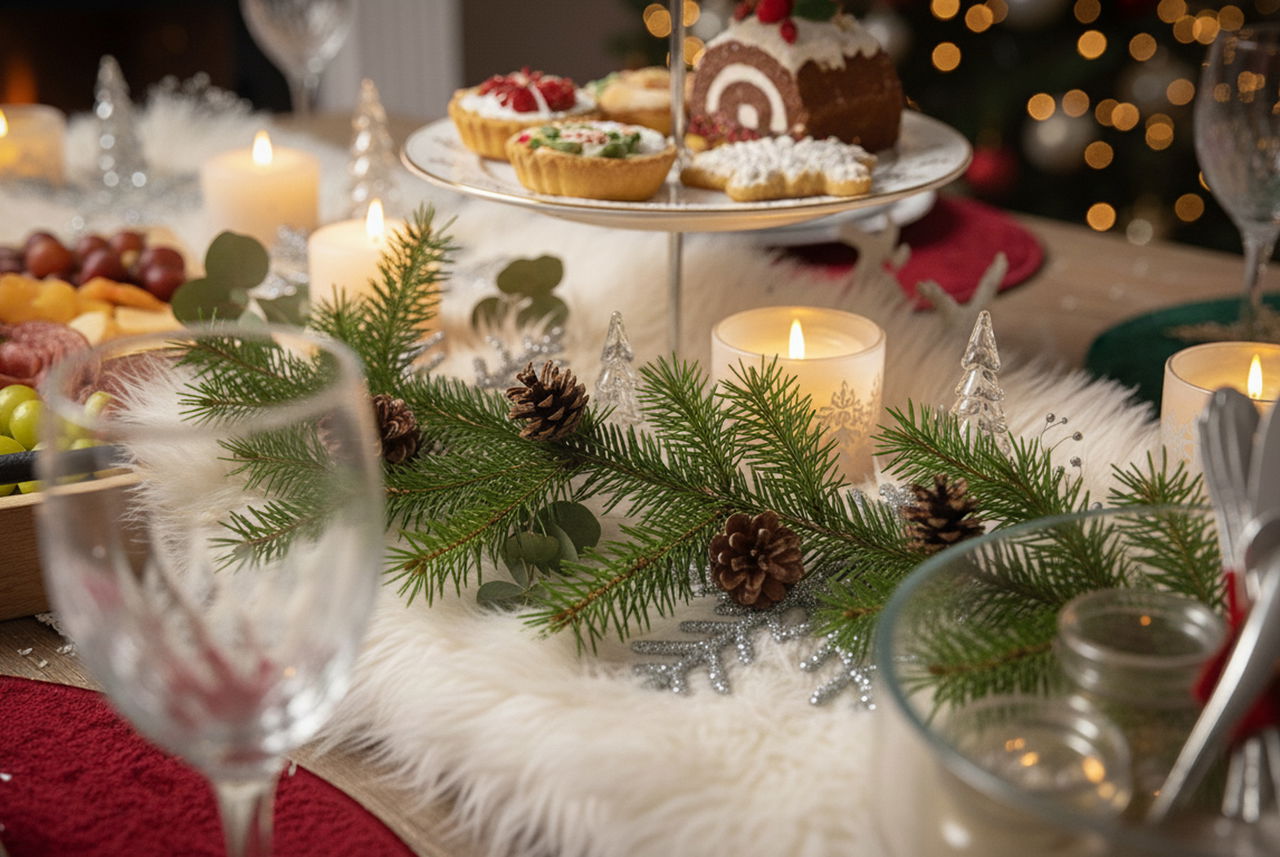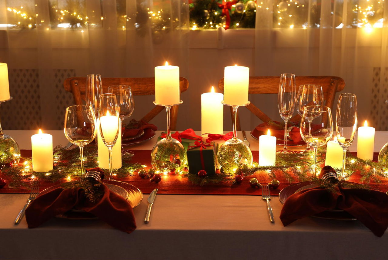 Catene luminose sottili, piccole luci LED o candele ben posizionate aiutano a creare quell’atmosfera magica che rende la tavola accogliente senza rubare spazio ai piatti.