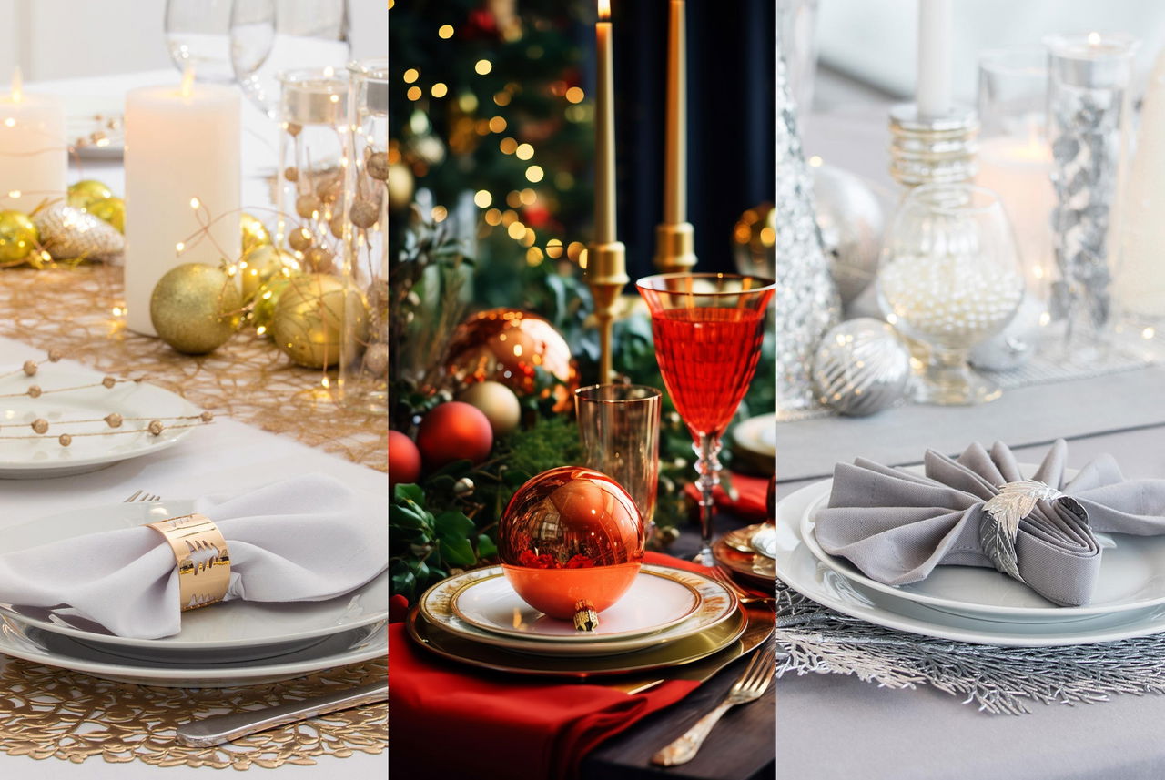 Oro e bianco per un risultato luminoso ed elegante, rosso vino per un tocco caldo e conviviale, oppure argento per un’atmosfera più moderna e festosa.