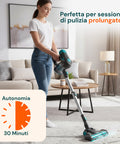 - Autonomia fino a 30 minuti: La batteria al litio da 22,2V assicura un'autonomia tra i 25 e i 30 minuti con una sola carica, consentendo di pulire più stanze senza interruzioni.