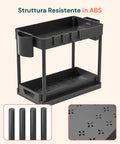 Grazie all'Organizer Multiuso a 2 Ripiani potrai finalmente dire addio al disordine sotto al lavello e in ogni altro spazio ristretto. La sua struttura intelligente permette di sfruttare lo spazio in verticale, mentre i ganci e i cestelli aggiuntivi offrono soluzioni pratiche per ogni esigenza di stoccaggio. Che tu voglia ordinare i detergenti in bagno o ottimizzare gli spazi in cucina, questo organizer è l’alleato perfetto. Il suo design compatto, ma estremamente capiente consente una gestione più efficiente degli oggetti di uso quotidiano, migliorando l’accessibilità e mantenendo ogni cosa al proprio posto.