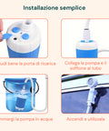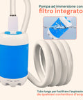 - Pompa e tubo flessibile: pompa ad immersione con filtro integrato e tubo lungo per facilitare l’aspirazione da qualsiasi contenitore d’acqua.