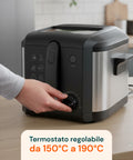 - Termostato regolabile: Consente di selezionare con precisione la temperatura di cottura da 150°C a 190°C, perfetta per ogni tipo di alimento.