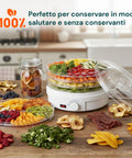 Con l' Essiccatore per Alimenti puoi conservare frutta, verdura, erbe e carne in modo naturale e salutare. Grazie ai suoi 5 vassoi impilabili e alla temperatura regolabile da 35° a 70°C, è l’alleato perfetto per preparare snack sani e genuini direttamente a casa tua, senza conservanti né additivi.