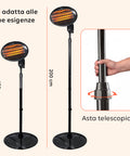 Riscalda le tue serate all’aperto con Ignis, la stufa a patio verticale dal design moderno e dalle alte prestazioni, perfetta per vivere gli spazi esterni in ogni stagione. Elegante, stabile e funzionale, questa stufa è progettata per offrire un comfort termico immediato, rendendo piacevoli anche le giornate più fredde su terrazzi, balconi, verande o giardini. La testa riscaldante inclinabile fino a 45° consente di orientare il calore nella direzione desiderata, garantendo una diffusione omogenea e costante della temperatura. L’altezza regolabile da 130 a 200 cm la rende versatile e facilmente adattabile a ogni ambiente, mentre le 3 intensità di riscaldamento (650W, 1300W e 2000W) permettono di modulare la potenza in base alle proprie esigenze, mantenendo sempre un consumo energetico equilibrato e un comfort ideale. Ignis è una stufa a patio autoportante, stabile e sicura, pensata per offrire il massimo delle prestazioni con un ingombro ridotto. Perfetta per cene, feste e momenti di relax all’aperto, unisce funzionalità e stile, trasformando ogni spazio in un’oasi accogliente e calda. Il design raffinato si integra facilmente con qualsiasi arredo outdoor, aggiungendo un tocco di eleganza e modernità.