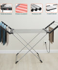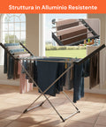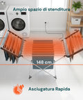 Il Magic Dry XL è progettato per offrire la massima comodità durante l’asciugatura dei capi, grazie al suo design funzionale e alla tecnologia di riscaldamento uniforme. Le sue 18 barre riscaldanti consentono di asciugare contemporaneamente lenzuola, maglie, pantaloni o asciugamani, riducendo i tempi rispetto a uno stendino tradizionale. I ripiani laterali riscaldanti e richiudibili permettono di adattare la struttura a ogni esigenza, mentre l’alluminio garantisce leggerezza e durata nel tempo. Con la sua potenza contenuta di 220W, il consumo è minimo, ma l’efficienza massima: perfetto per chi cerca una soluzione ecologica, pratica e silenziosa. Quando non in uso, si piega completamente, occupando pochissimo spazio e risultando facile da riporre. Un prodotto ideale per chi vive in appartamento o desidera mantenere i propri capi asciutti e in perfetto ordine anche durante le stagioni umide.