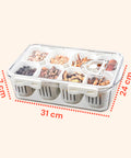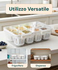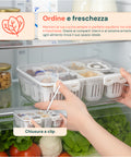 Massimizza l’ordine e l’organizzazione dei tuoi spazi con il Contenitore Multiuso 8 Scomparti in PP, una soluzione pratica e versatile per conservare e tenere in perfetto ordine ogni tipo di oggetto. Realizzato in PP (polipropilene) di alta qualità, un materiale resistente, igienico e facile da pulire, questo contenitore è progettato per offrire la massima funzionalità sia in ambito domestico che professionale. Il suo design moderno e compatto (7 × 31 × 24 cm) consente di inserirlo facilmente in cassetti, dispense o scaffali, ottimizzando al meglio lo spazio disponibile. Grazie ai suoi 8 scomparti indipendenti, il contenitore permette di separare e organizzare perfettamente utensili, alimenti, accessori per ufficio, minuterie o articoli per la cura personale. La pratica chiusura a clip assicura una tenuta stabile e sicura, impedendo l’apertura accidentale e proteggendo il contenuto da polvere, umidità e sporco. Il sistema ad incastro consente inoltre di impilare più contenitori, creando una struttura modulare stabile e ordinata. La funzione sgocciolatoio integrata è particolarmente utile per la conservazione di alimenti freschi o lavati, poiché permette all’acqua di defluire, mantenendo i prodotti asciutti e igienici.