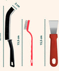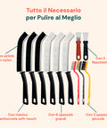 - 3 spazzole per fornelli e rubinetti: Perfette per trattare le incrostazioni intorno ai bruciatori, manopole del gas e rubinetteria. Progettate per penetrare nei punti più critici senza graffiare acciaio o ceramica.