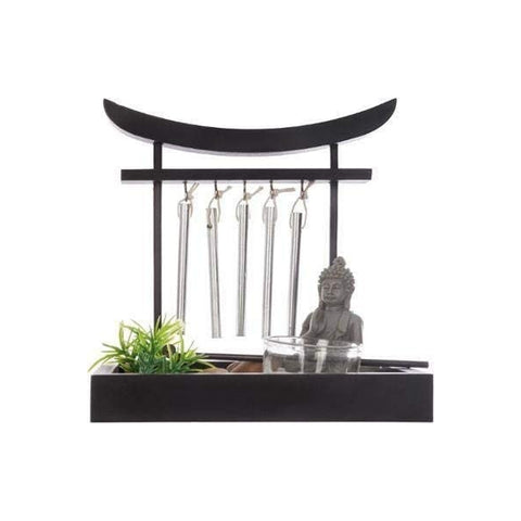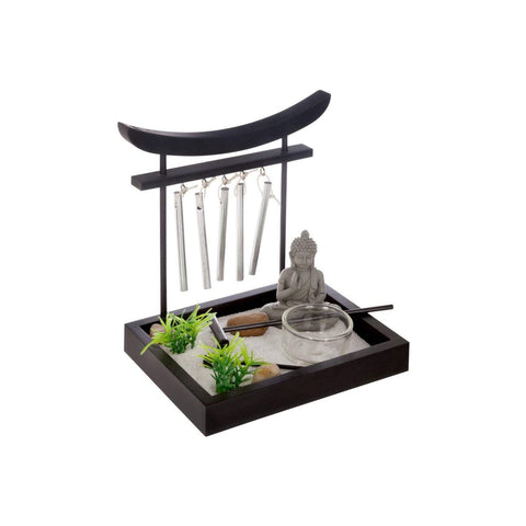 Il giardino è composto da un plateau in legno, su cui sono disposti sabbia, pietre, un Buddha e delle campanelle. Il movimento delle pietre e delle campanelle crea un suono rilassante e armonioso, che aiuta a ritrovare la calma e la concentrazione.