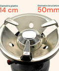 - Bruciatore da 50 mm – diametro piatto 140 mm: Garantisce una fiamma stabile e cottura uniforme.