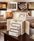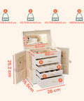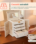 Il Portagioie con Specchio e 4 Cassetti combina funzionalità, eleganza e capienza in un unico accessorio indispensabile per la cura dei tuoi gioielli. Ogni dettaglio è studiato per offrire ordine, protezione e praticità: i 16 ganci per collane evitano grovigli, mentre i 4 cassetti scorrevoli e gli scomparti regolabili consentono di personalizzare lo spazio in base alle tue esigenze. Il rivestimento interno antigraffio protegge i tuoi preziosi da urti e abrasioni, mentre lo specchio integrato aggiunge un tocco di comfort e funzionalità quotidiana. Il design raffinato, con finiture dorate e una struttura stabile, lo rende un vero e proprio elemento d’arredo, perfetto per camere da letto, cabine armadio o toilette. Un prodotto pensato per chi ama la bellezza nei dettagli e desidera un portagioie elegante, capiente e durevole.