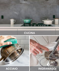 - Azione: rimuove efficacemente grasso, olio, sporco incrostato e residui di cucina.