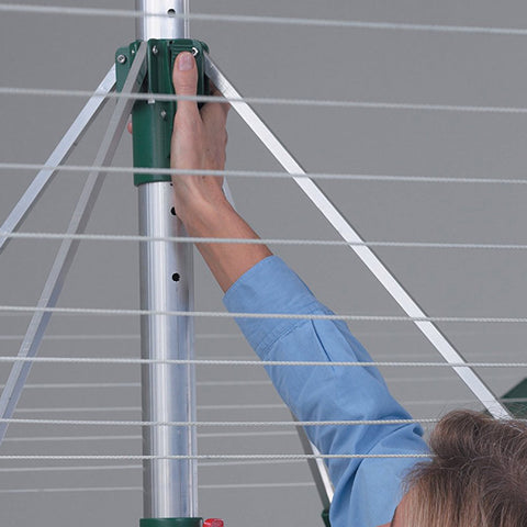 Asciugatura rapida e uniforme grazie alla superficie ampia e alla possibilità di regolare l'altezza. Facile da usare grazie al sistema di avvolgimento automatico delle corde. Resistente alle intemperie grazie alla struttura in alluminio e plastica.