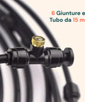 • Kit irrigazione a goccia da 15 metri: Sistema versatile per piante in vaso, orti o spazi esterni, con funzione di rinfrescamento nebulizzante.