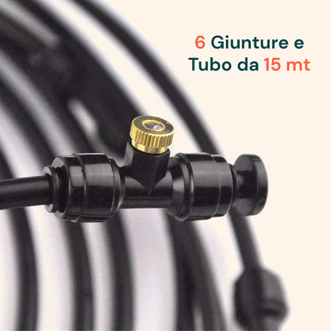 Grazie ai 6 raccordi a T con ugelli nebulizzanti inclusi e 15 metri di tubo, il kit copre una superficie di circa 15–20 m², ideale per terrazze, orti rialzati, pergolati o per creare zone d’ombra rinfrescanti.